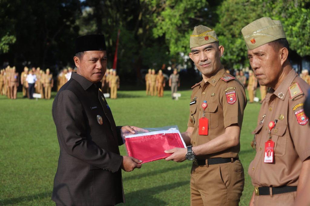 Penyerahan 10 juta bendera merah putih melalui Kepala Perangkat Daerah yang kemudian dilanjutkan kepada lapisan masyarakat dilakukan disela kegiatan pelaksanaan apel mingguan Pemerintah Kabupaten Lampung Barat.