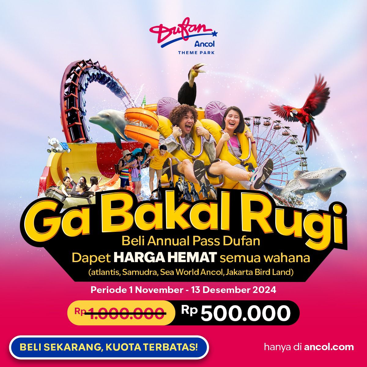 Jakarta, 5 November 2024 – November ini, Dufan Ancol memberikan kabar baik bagi para sobat Dufan yaitu Promo Annual Pass mulai dengan berbagai keuntungan menarik yang sayang untuk dilewatkan. Dengan Annual Pass Dufan, selain bisa mendapatkan akses ke Dufan sepanjang tahun penuh, para member juga mendapatkan benefit tambahan yaitu potongan harga sebesar 20% untuk kunjungan ke unit-unit rekreasi Ancol lainnya seperti Sea World Ancol, Samudra Ancol, Atlantis Ancol, dan juga Jakarta Bird Land Ancol.