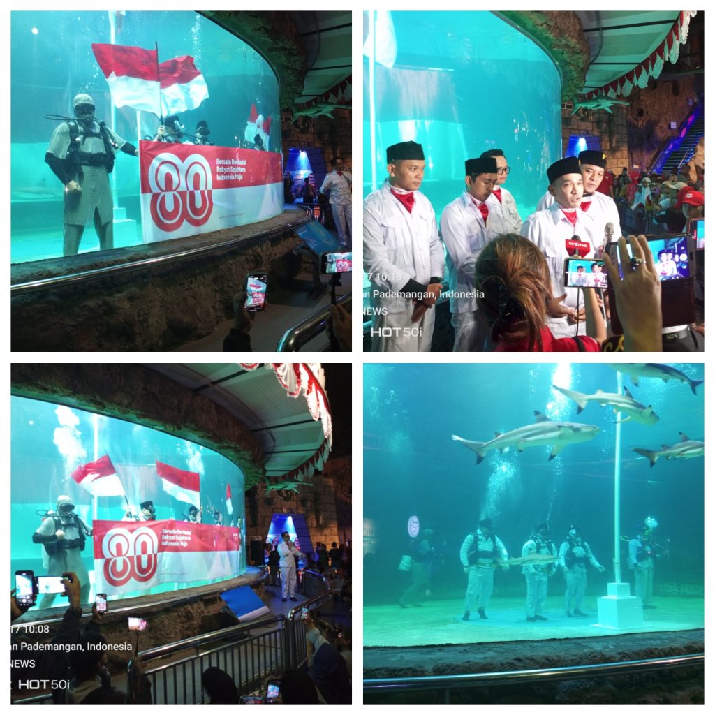 Pengibaran Bendera didalam Aquarium Ikan Hiu oleh Ruben Onsu dan Team Seaworld sukses memukau Pengunjung